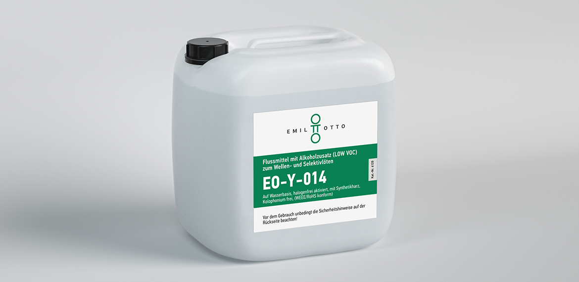 Alle Flussmittel der Produktserie EO-Y-014 sind universell zum Wellen- und Selektivlöten von Leiterplatten geeignet und enthalten organische, halogenfreie, aktivierende Additive formuliert mit geringem Zusatz von synthetischem Harz. „Das Flussmittel wurde in einer speziell auf die thermischen Anforderungen des Lötprozesses abgestimmten Kombination mit blei- und bleifreien Loten entwickelt. Des Weiteren enthalten die EO-Y-014A-, B- und C-Versionen spezielle alkoholische Additive zur Stabilisierung und Verbesserung der Trocknungszeiten im Vergleich zu herkömmlichen Flussmitteln auf Wasser- oder Teilwasserbasis. Aus diesem Grund kann dieses Flussmittel reine alkoholbasierende Flussmittel sehr gut ersetzen,“ führt Geßner weiter aus. Der Einsatz beim Handlöten und Kabelkonfektionieren ist ebenfalls möglich und sorgt auch bei diesen Anforderungen für sehr gute Lötergebnisse.