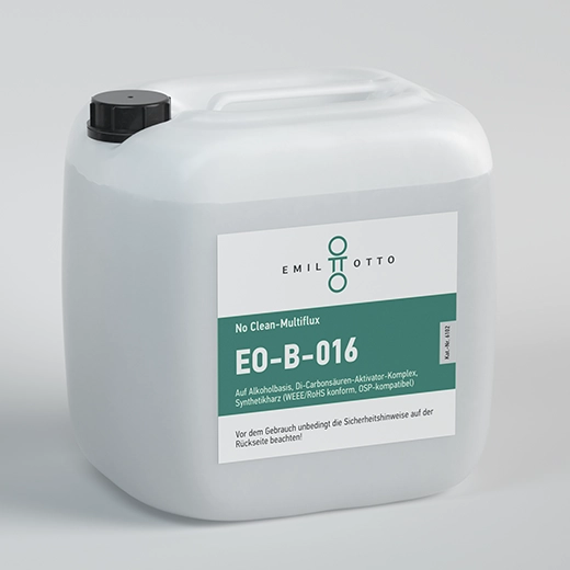 „Unser EO-B-016 ist ein MULTI-FLUX-Flussmittel und wurde speziell für das Selektivlöten entwickelt. Es eignet sich allerdings auch bestens für den Einsatz im Wellen- und manuellen Lötprozessen, sowie für das Tauchlötverfahren und die Litzenverzinnung. Die Applikation kann durch alle üblichen Auftragsverfahren außer Schäumen erfolgen. Der Feststoffanteil beträgt 5 Gew.-%“, erklärt Markus Geßner, Marketing- und Vertriebsverantwortlicher der Emil Otto GmbH. Geßner führt weiter aus, dass das EO-B-016 sehr gute Löteigenschaften, besonders beim Durchstieg, der Benetzung sowie der Sauberkeit aufweist. Auch bei überalterten bzw. überlagerten Leiterplatten und Bauteilen können mit dem EO-B-016 sehr gute Lötergebnisse erzielt werden. Das Prozessfenster des Flussmittels ist sehr breit, bei einer hohen thermischen Stabilität und einer guten Prozessaktivität über ein langen Zeitintervall. „Das Rückstandsverhalten ist ebenfalls sehr gut. Die Leiterplatten sind nach dem Lötprozess nahezu rückstandsfrei und dass trotz eines höheren Feststoffgehalts“, ergänzt Geßner.