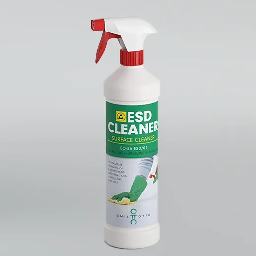 Le deuxième nouveau nettoyant ESD est un concentré spécialement conçu pour une utilisation quotidienne dans le cadre du nettoyage humide des sols. EO-RA-ESD/02 peut être utilisé aussi bien pour le nettoyage manuel que pour l'utilisation en machine sur des sols conducteurs et dissipatifs. L'effet nettoyant de l'EO-RA-ESD/02 est aussi bon que celui de l'EO-RA-ESD/01. La compatibilité avec les revêtements de sol courants tels que le PVC, le linoléum, la pierre artificielle et naturelle est bonne, de sorte que le nettoyant peut être utilisé en dehors de la production électronique. Le nettoyant pour sols ESD est très économique, 5-20 ml pour 1 litre suffisent. Un dosage approprié permet de réduire les coûts et de préserver l'environnement.