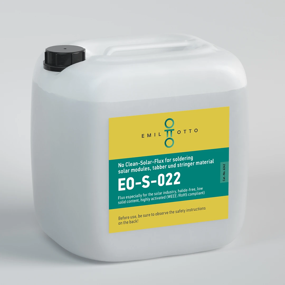 Le nouveau flux SOLAR FLUX-EO-S-022 a une teneur en matières solides de 2 % et a été spécialement développé pour le brasage des modules solaires, du matériel Tabber et Stringer ainsi que pour l'assemblage des cellules. Le flux incolore et transparent No-Clean est basé sur une formulation sans résine synthétique ni colophane. Le nouveau flux solaire convainc par sa forte activation, ne laisse aucun résidu collant et n'est pas corrosif. Les activateurs sont en outre spécialement conçus pour les températures élevées des processus de fabrication des modules solaires. Le flux EO-S-002 est également disponible en version à séchage rapide EO-S-022/FD. Emil Otto propose également le flux sous forme de gel de flux SOLAR FLUX GEL EO-S-022 et de concentré. Sous cette dernière forme, le flux peut être transporté et stocké de manière traditionnelle en réduisant le volume et les coûts.
